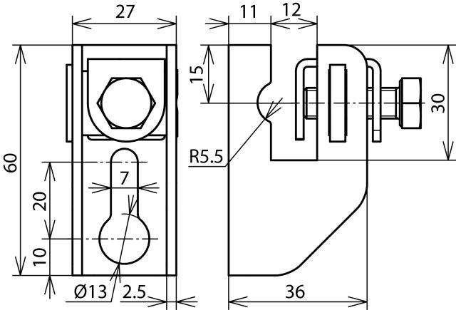 Зажим с болтом M8 для плоского проводника до 11 мм и круглого проводника 6-10 мм.