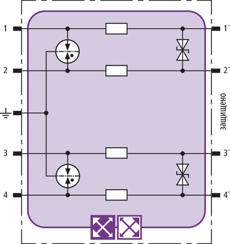 Модуль компактного комбинированного разрядника тока молнии / ограничителя импульсных перенапряжений с системой контроля состояния LifeCheck для защиты 2-х двухпроводных незаземленных симметричных интерфейсов. Система LifeCheck определяет электрические или тепловые перегрузки защитных компонентов, после которых разрядник необходимо заменять. Считывает информацию о рабочем состоянии за секунды с применением бесконтактной технологии RFID при помощи портативного прибора DEHNrecord LC / SCM / MCM.